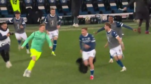 比赛哨响后比勒菲尔德球员冲进场庆祝,还有人被自己扔的衣服绊倒。比勒菲尔德主帅脸都红了。