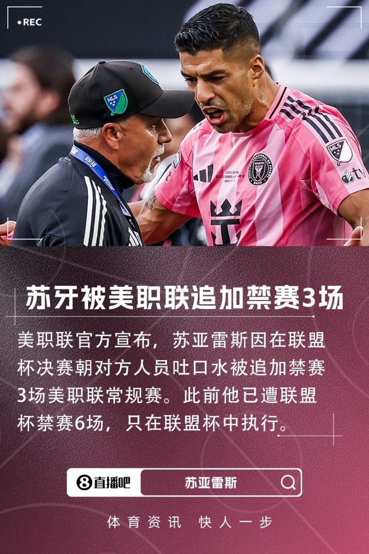 9月9日,美国职业足球大联盟官方宣布,因在联盟杯决赛中向对方人员吐口水,迈阿密国际前锋苏亚雷斯被处以停赛3场MLS常规赛的处罚,而队友布斯克茨未受到追加停赛。